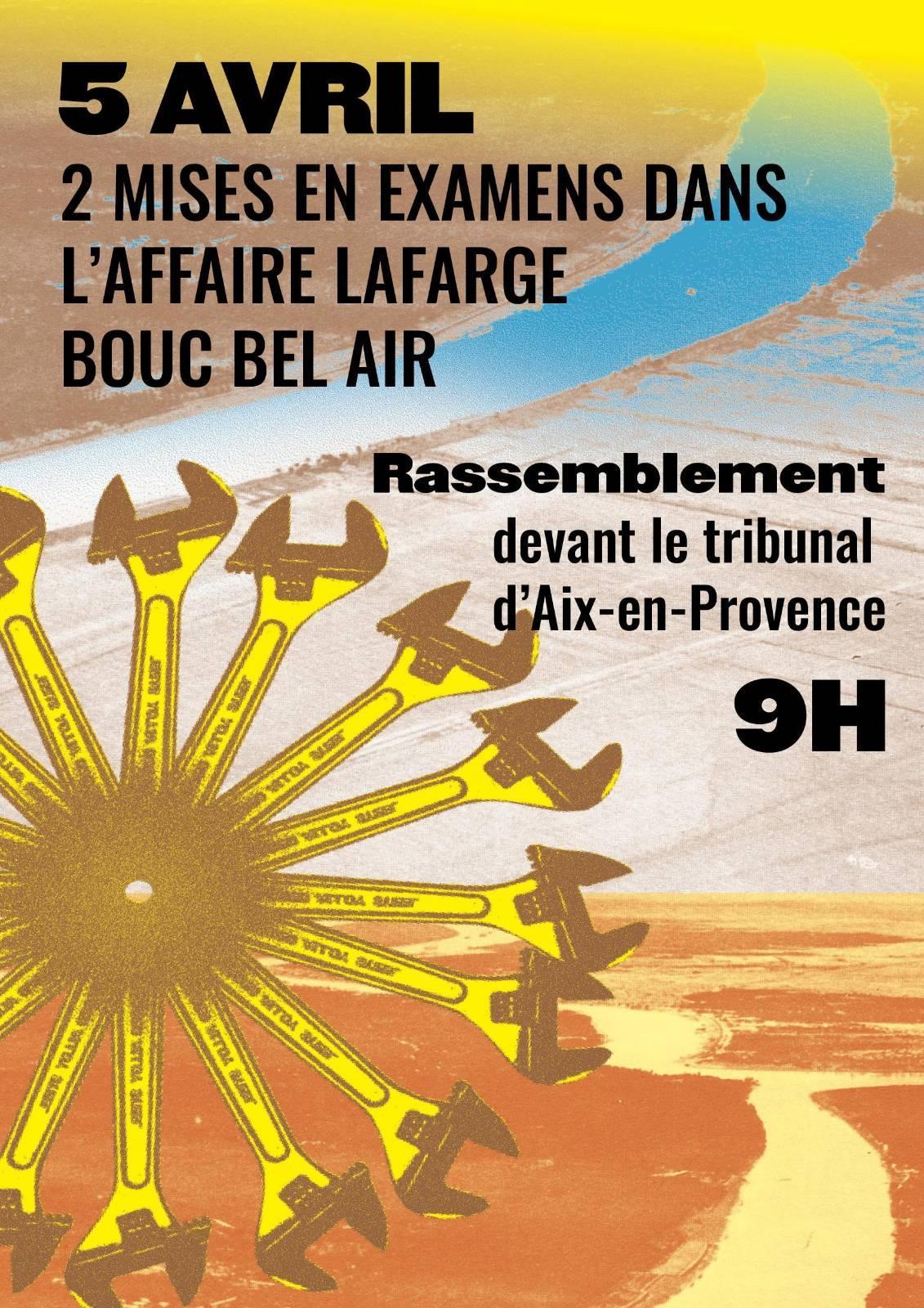 Ce 5 avril 2024 à partir de 9H30 aura lieu au tribunal d’Aix-en-Provence l’audience en vue de la mise en examen de deux personnes arrêtées au début de l’été dernier dans le cadre de l’affaire Lafarge. Ce jour là, rassemblons-nous pour signifier notre solidarité aux mis.e.s en examen.