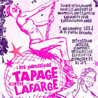 Le samedi 7 décembre, nous nous retrouverons à la Parole Errante à Montreuil pour amplifier le combat contre Lafarge-Holcim. Au programme, discussions autour de Lafarge, atelier anti-répression sur la base des moyens d’enquête de l’affaire Bouc-Bel-Air, exposition, infokiosque, cantines et enfin une grosse soirée pour assomer Lafarge et son monde !