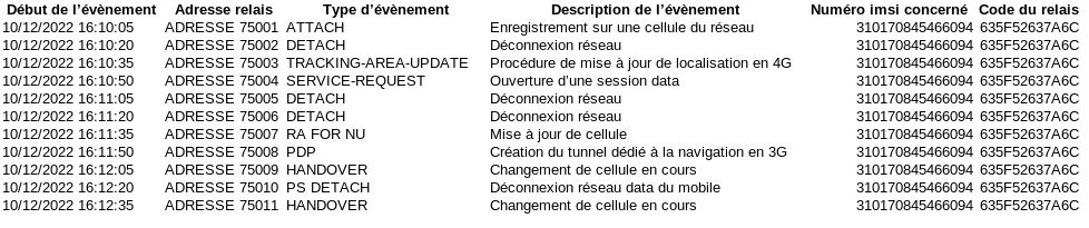 Un téléphone, même quand il n’émet ni ne reçoit de communication téléphonique (SMS, MMS, appels, données mobiles), échange très régulièrement des informations avec les antennes relais à proximité, notamment pour que le réseau sache où envoyer les éventuelles communications que le téléphone pourra recevoir (ces échanges d’informations permettent par exemple au téléphone d’afficher un niveau de réseau, qui s’affiche en haut à droite ou à gauche de l’écran). Ces données ne sont pas des « communications téléphoniques » à proprement parler, elles n’aparaissent donc pas sur les fadettes, et les opérateurs les appellent « évènements réseaux » [2]. Les condés peuvent les réquisitionner au même titre que pour les fadettes. Notons que Free ne les donne pas aux keufs probablement parce qu’il n’enregistre pas ces « évènements réseaux ». Chaque ligne du tableau des fadettes peut être séparée facilement d’une dizaine de minutes (il suffit que les données mobiles soient désactivées ou même que l’activité internet soit relativement faible), ce qui ne permet pas aux keufs de localiser très précisément la ligne. L’avantage des évènements réseaux est donc qu’ils ont lieu très régulièrement (en moyenne toutes les 25 secondes (valeurs prises un peu au pif, on a juste pris un exemple de listing d’évènements réseaux et fait une moyenne), permettant un suivi plus précis des déplacements d’une personne. Pour donner un exemple, un extrait des évènements réseaux d’une ligne téléphonique, ça donne ça :